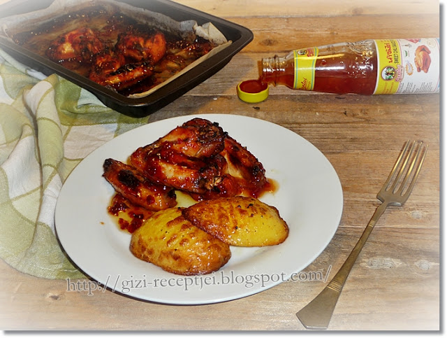 Nemrégiben egy kedves barátnőm megajándékozott egy üveg édes chili szósszal, melyet a hétvégi ebéd készítéséhez mindenképpen szerettem volna felhasználni. Így aztán vásároltam néhány csirkeszárnyat, majd bepácoltam ebbe a pikáns szószba, és végül szép pirosra sütöttem. Bevallom én eddig mindig saját magam készítettem a pácot melyben a húst sütöttem, de ez a Lidl-ben készen vásárolt éppen olyan finom. Így aztán a hétvégi ebéd elkészítéséhez bátran merem ajánlani akár ezt az édes-pikáns-chili szószt, mellyel szinte semmi dolgunk nincs, vagy éppen a saját magunk által készített édes-csípős pácot. Tálaláskor a finom szaftos, ragacsos csirkeszárnyakat pedig szintén a sütőben készíthető hasselback burgonyával kínáltam.
