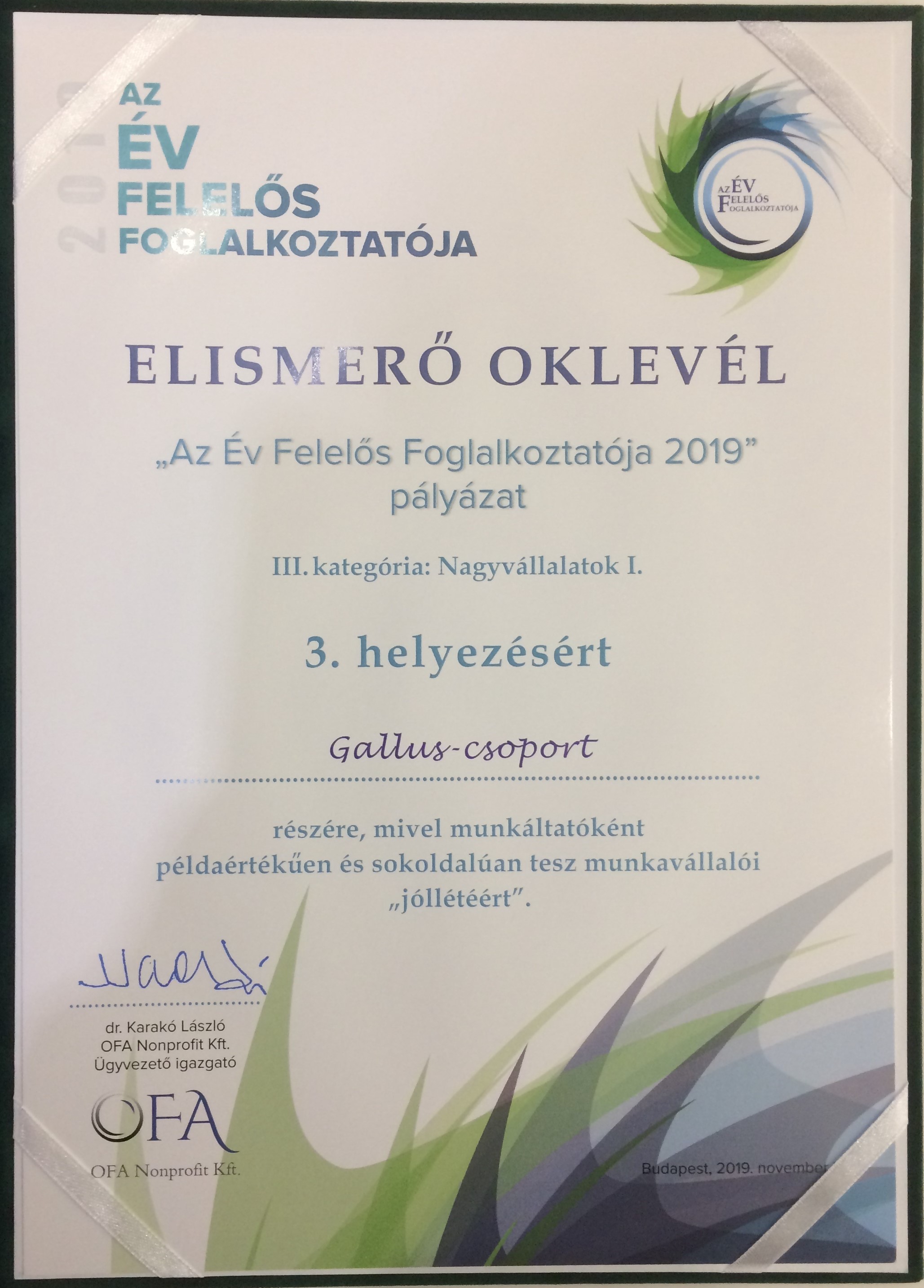 A nagyvállalatok I. kategóriában a répcelaki Linde Gáz Magyarország Zrt. kapta meg az Év Felelős Foglalkoztatója 2019 díjat, a Gallus-csoport – ide tartozik a sárvári Taravis Kft. is – harmadik helyezést ért el.